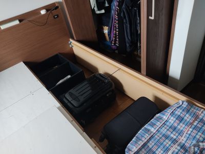 ベッド下にも収納があるので、しばらく使わない物はここに突っ込む。