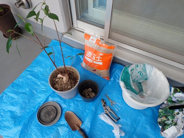 ネットで調べて、鉢底石+赤玉土+観葉植物の土を用意。